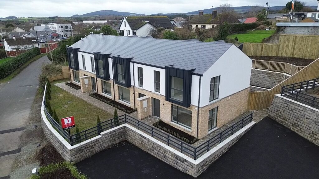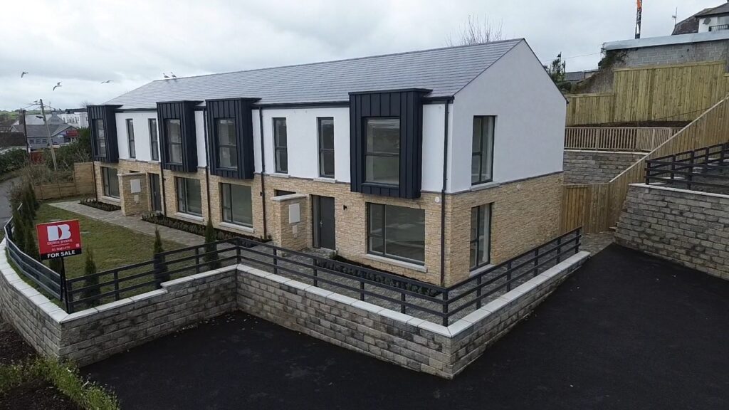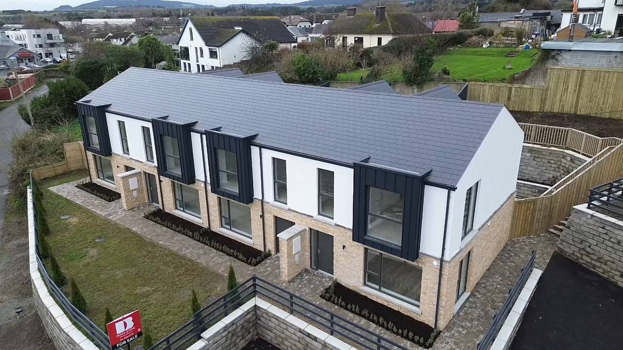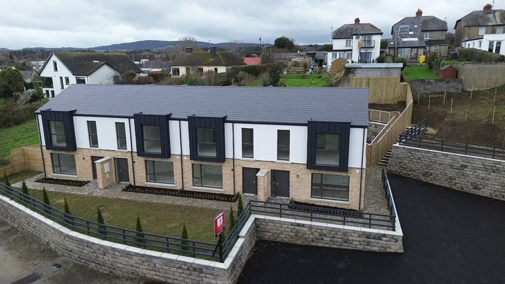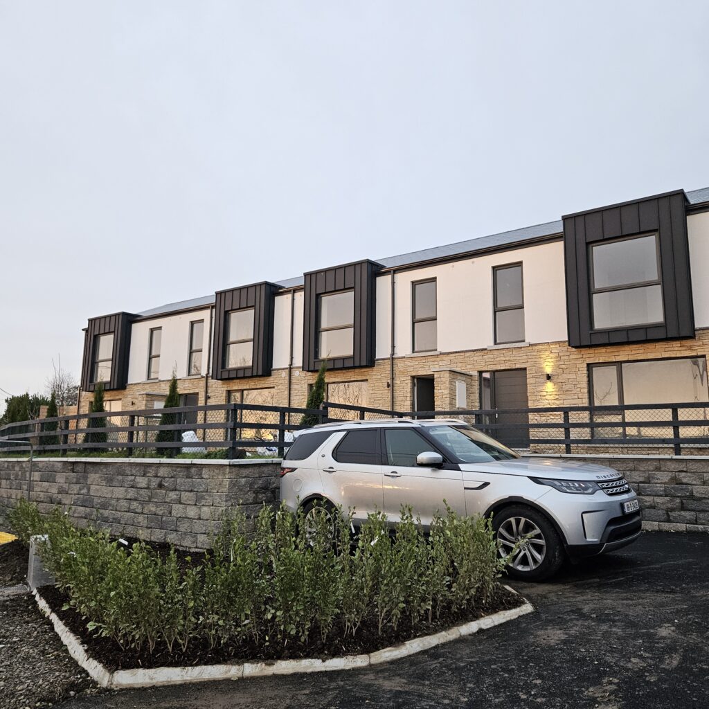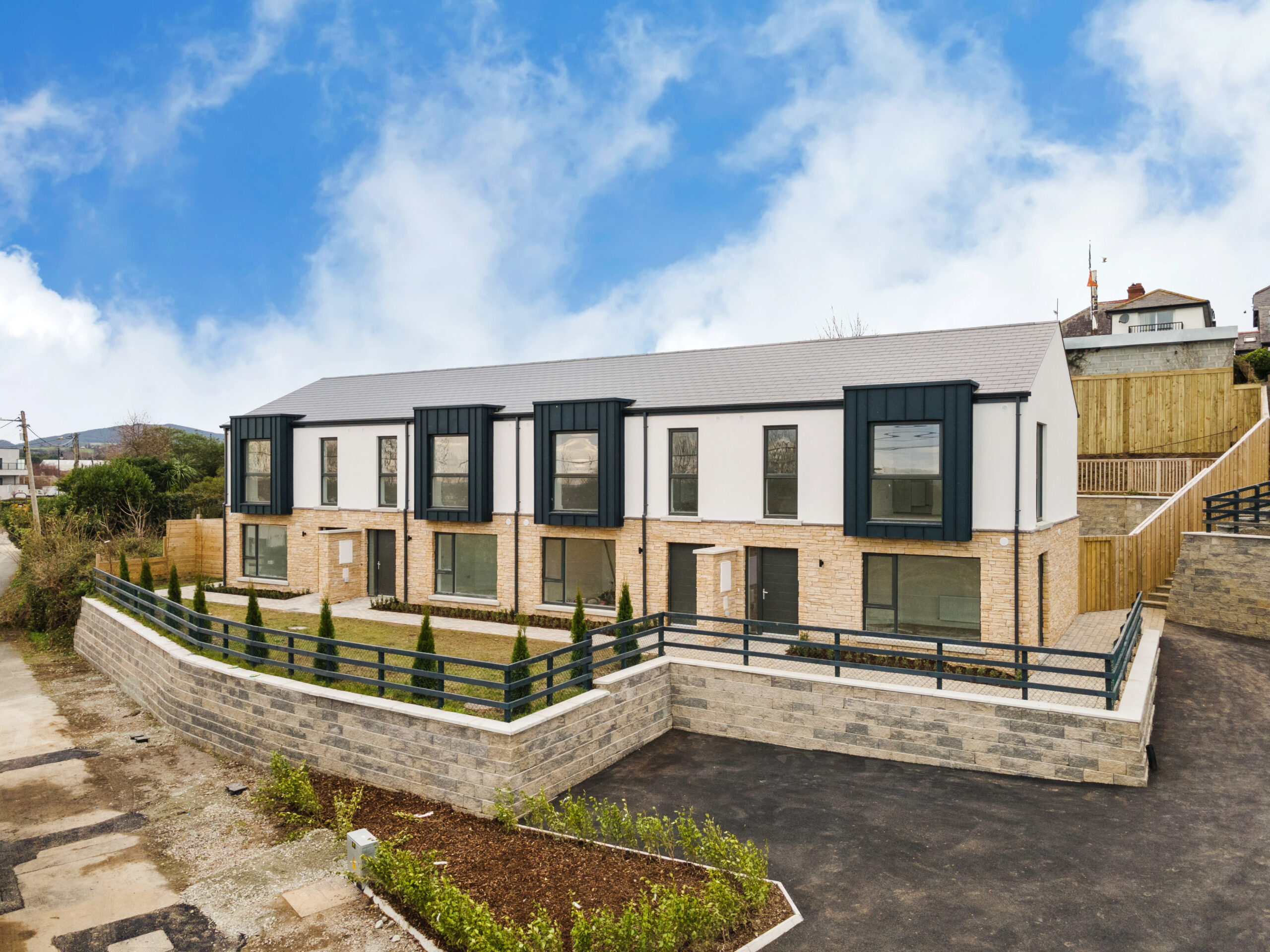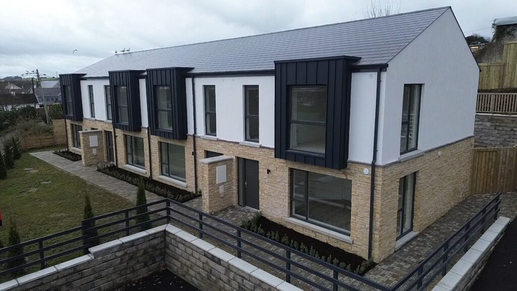 Within walking distance of Kilcoole Main Street and Kilcoole Beach, the homes offer a convenient village setting close to the coast. The front elevation combines a natural stone base with a light rendered upper level, with metal-clad projecting window elements adding depth and a strong contemporary presence to the terrace.