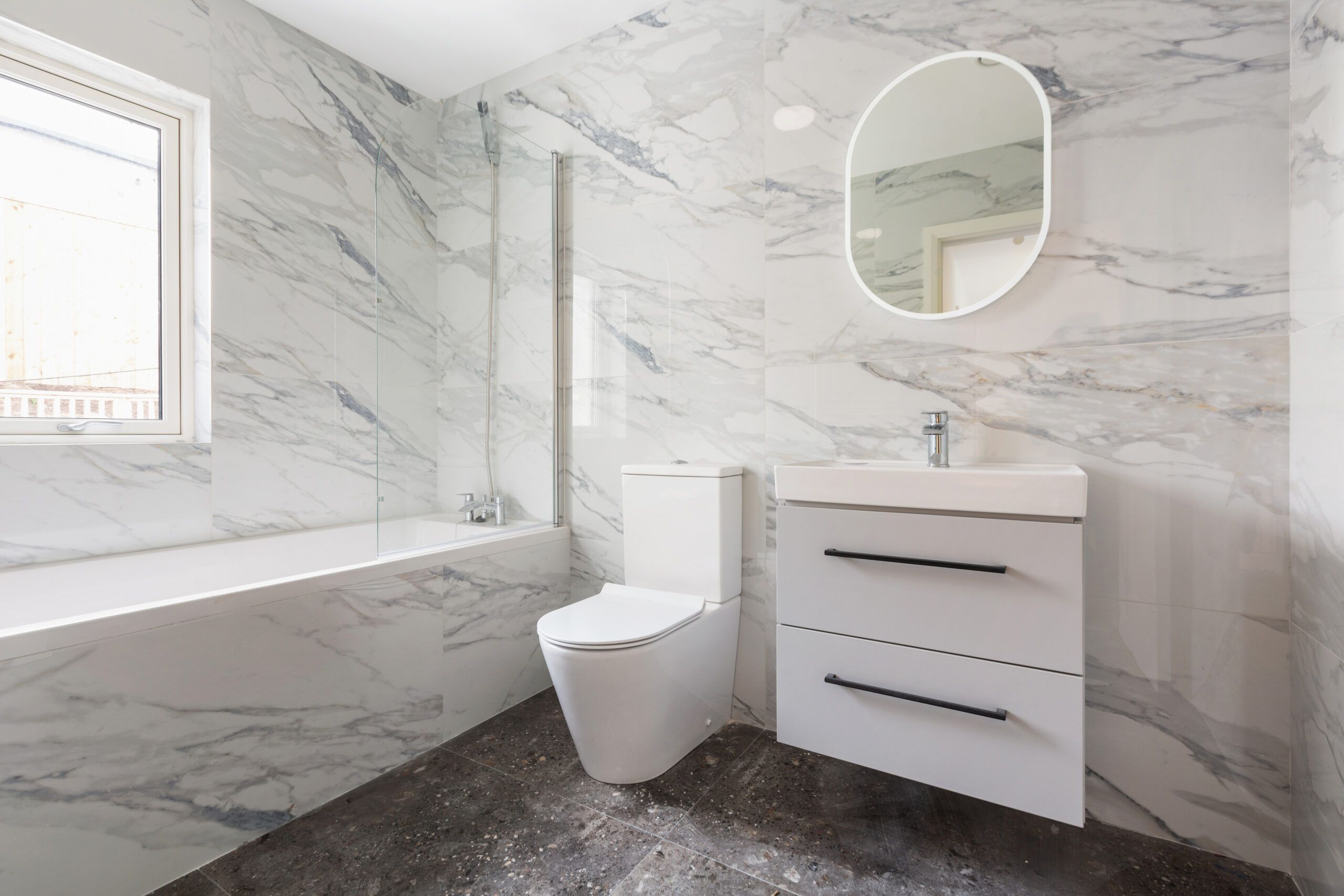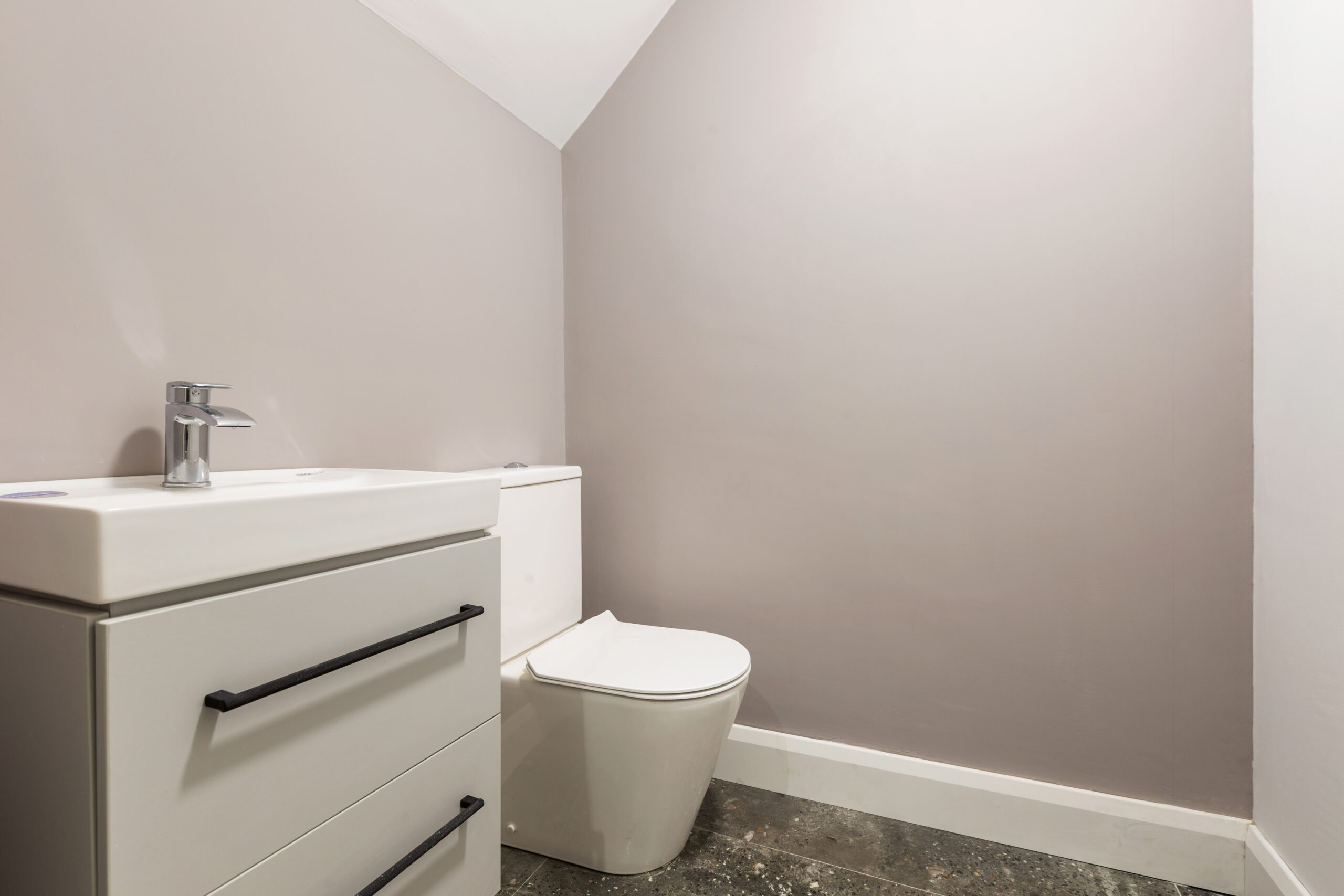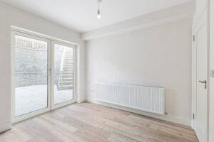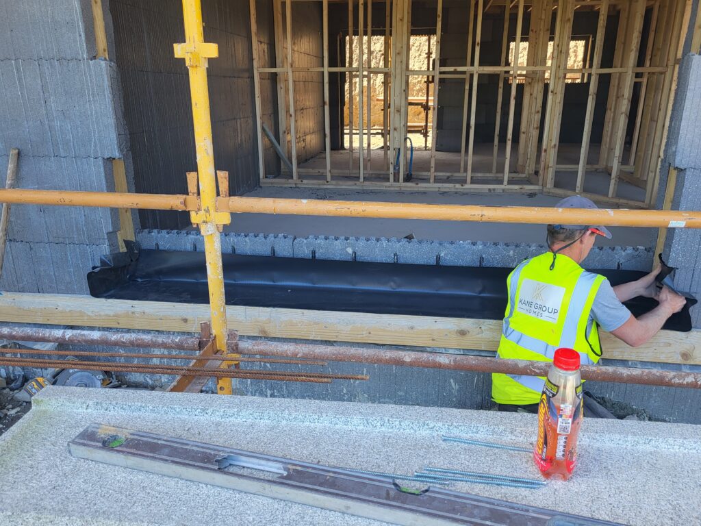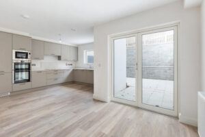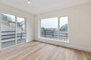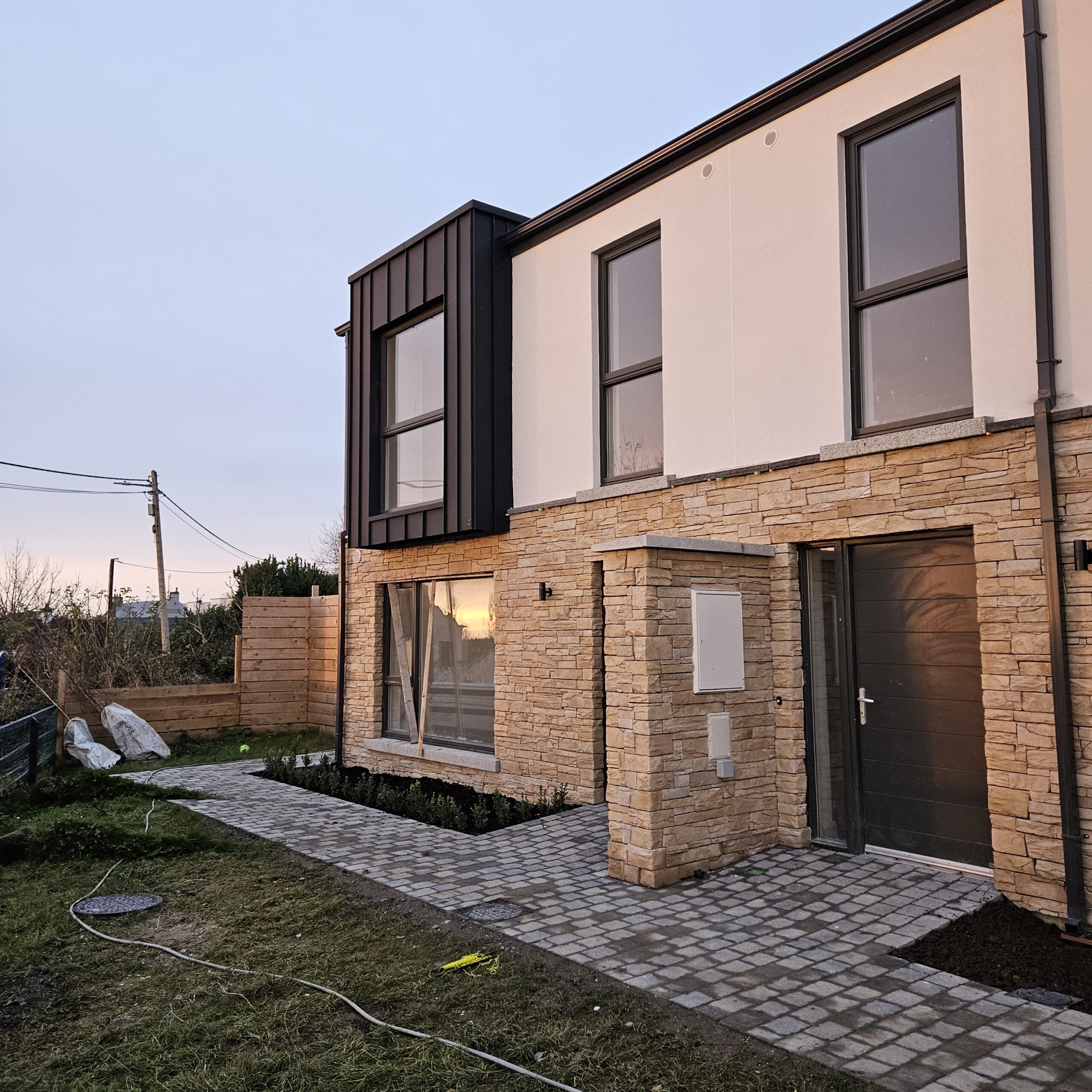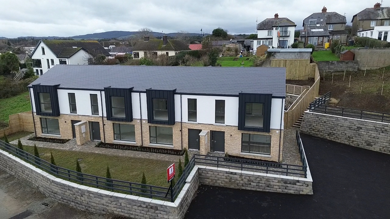 Within walking distance of Kilcoole Main Street and Kilcoole Beach, the homes offer a convenient village setting close to the coast. The front elevation combines a natural stone base with a light rendered upper level, with metal-clad projecting window elements adding depth and a strong contemporary presence to the terrace.